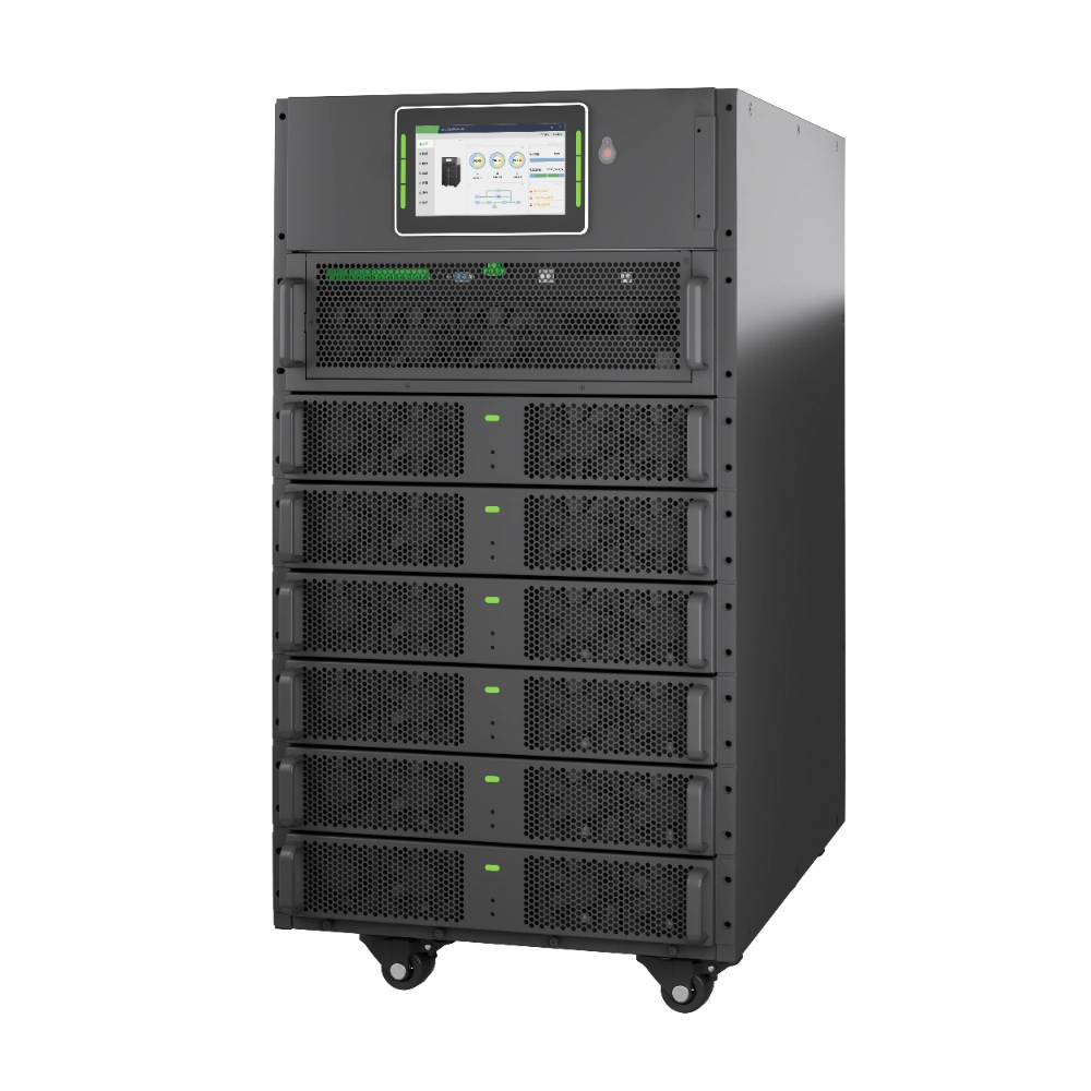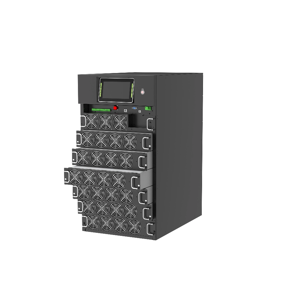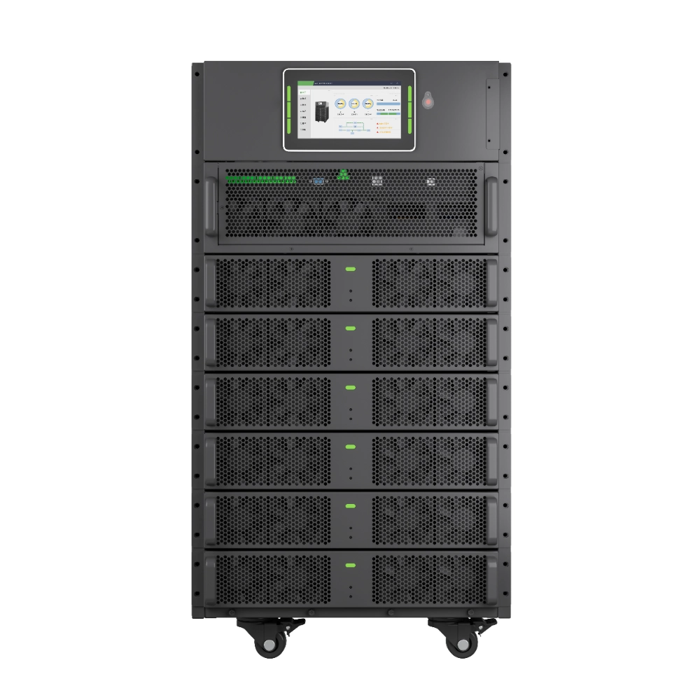 120kW 3-phase modular online UPS system is designed for high-performance, reliable power protection. It supports a wide input voltage range of 304-478VAC (line voltage) and operates within a frequency range of 40-70Hz. With an input power factor greater than 0.99 and low current distortion (THDi <3% at full load), it ensures efficient power usage. The output delivers stable voltage (380/400/415VAC) with a power factor of 1 and minimal total harmonic distortion (<1% for linear loads), providing clean and reliable power. The system offers fast dynamic response, with recovery times under 20ms. Additionally, it includes overload protection with automatic bypass, ensuring continuous operation under varying load conditions. This UPS is ideal for demanding applications requiring high accuracy, reliability, and energy efficiency.