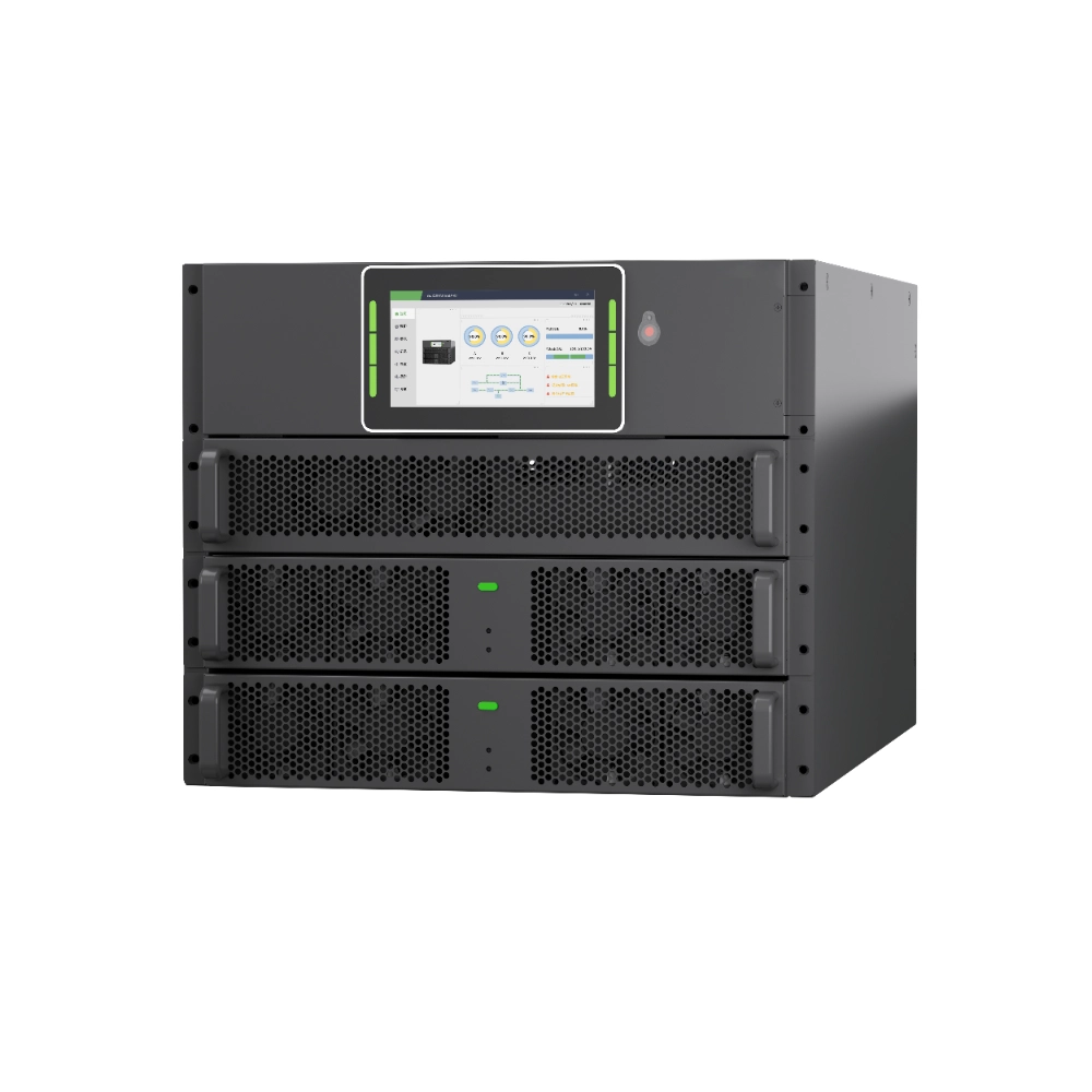 40KW Rack-Mounted Modular UPS system is engineered for high power density and modular efficiency, ideal for environments with limited space yet high power requirements. It features a 20-40kVA PK tower-style power model with a modular 3-phase input and output configuration. The total system capacity is no less than 40kVA, with each power module rated at 20kVA or higher, and at least two power modules are included to ensure redundancy. The UPS is designed for rack-mounted installation with a maximum height of 9U and each power module occupies no more than 2U. With a depth of 700mm, the unit provides sufficient rear space for wiring and maintenance, ensuring easy access and efficient installation while optimizing power density.